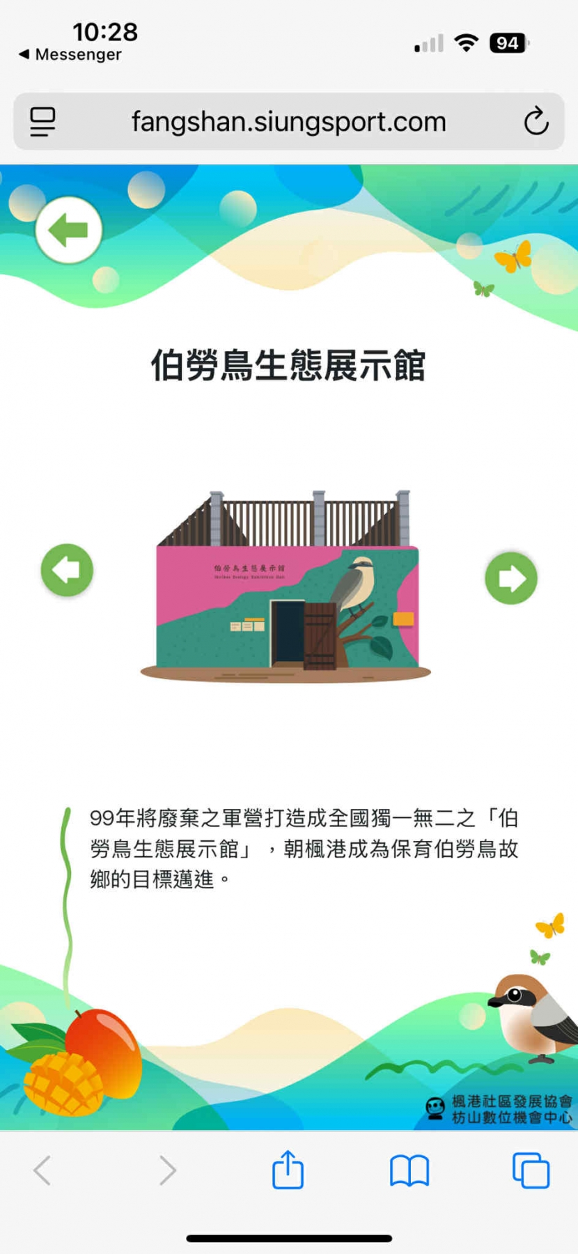 屏東枋山DOC「AR互動生態體驗平台」,導入「AR互動生態體驗平台」,透過擴增實境(AR)技術,將社區IP、在地文化、觀光與產業串聯起來,遊客只需透過手機或平板,就能在特定的場景中與虛擬的伯勞鳥互動;也能探索隱藏在街區中的文化故事,讓單純的參訪行程轉變為一場充滿驚喜的尋寶之旅。