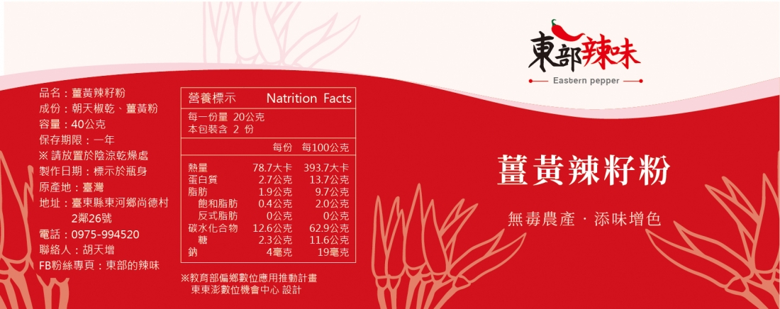 透過EDM的課程,與講師溝通目前想為產品設計更精美包裝的想法,延伸出全新的東部辣味品牌形象,及薑黃辣籽粉罐裝外觀貼紙。從產品形象開始,胡小姐很認真的和講師述說自己的創業理念及故事,講師再協助引導他在白紙上先繪製出自己想要的形象草圖,之後在進入電腦數位化調整,一個全新的品牌包裝形象誕生。
