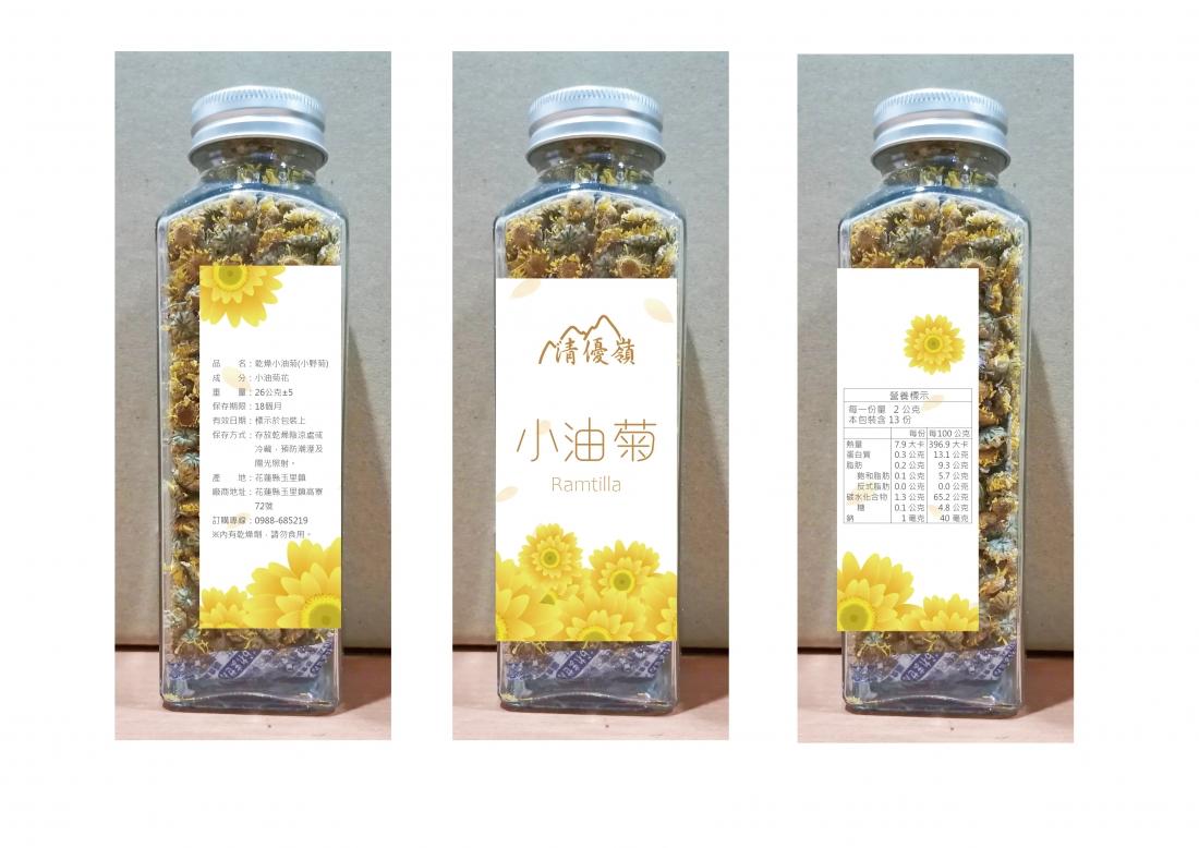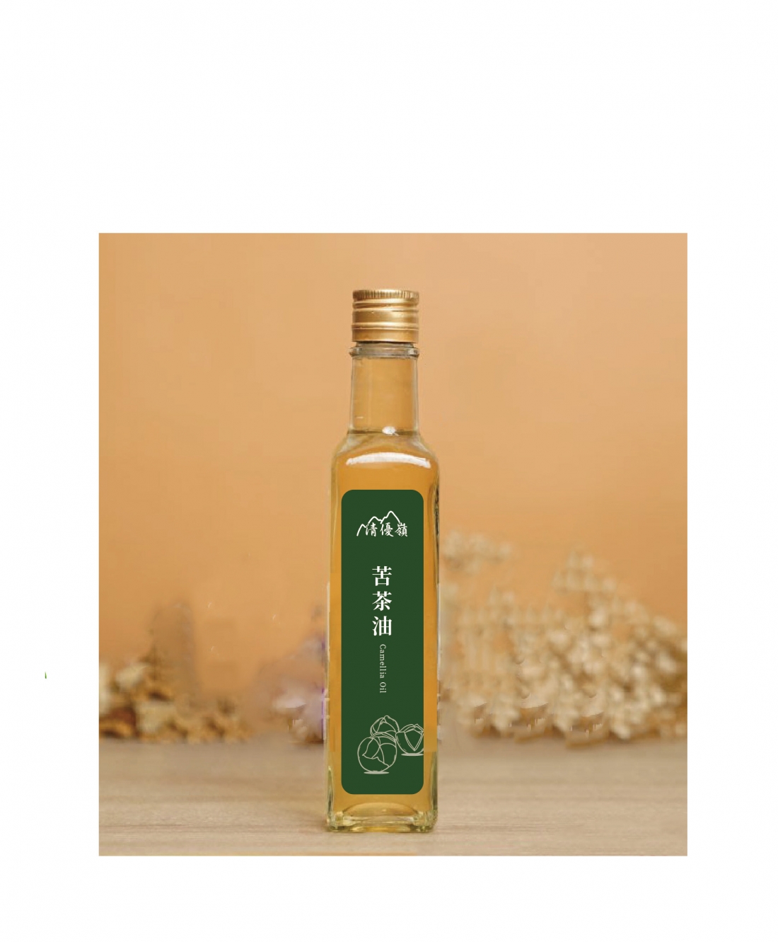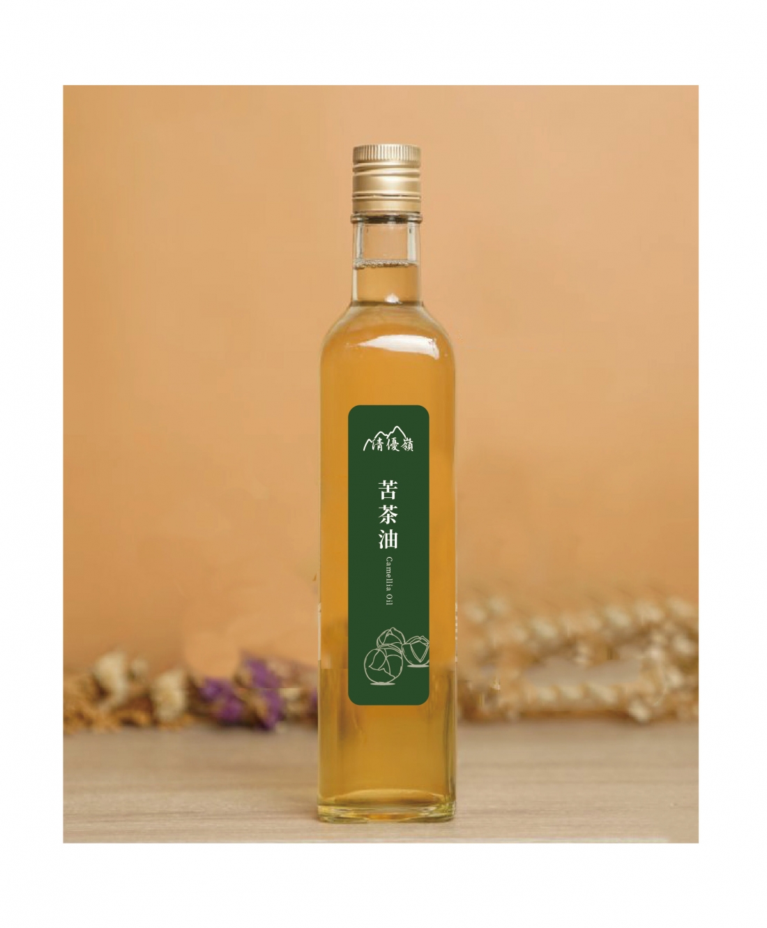 苦茶油貼紙的設計,是一個款式,適用於兩種尺寸玻璃瓶以及外盒達到包材共用性,減少印刷成本。以簡約為主,只要打上LOGO與文字,採用墨綠色,搭配苦茶籽小圖,並將小圖燙銀便可提升質感。
